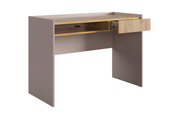 Корпус стола выполнен в цвете кашемир, что придает ему современный и спокойный вид, легко сочетающийся с любым интерьером. Выкатной ящик в цвете "дуб крафт золотой", декорирован принтом, имитирующим вертикальную фрезеровку, что добавляет столу уникальности и роскоши.