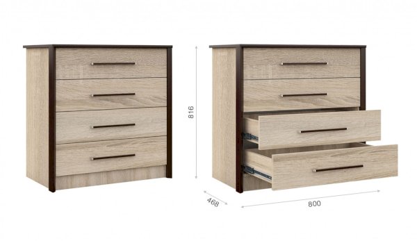 Классический комод Эшли - функциональное дополнение интерьера. Подходит для хранения белья, одежды и текстиля. Ящики на телескопических направляющих, позволяют рационально использовать всё внутреннее пространство, обеспечивая удобный и легкий доступ ко всему содержимому. Скргуленные края верхней крышки и профиля из МДФ 22мм по внешним краям - максимально безопасное использование мебели. Детали цвета венге подчеркивают древесную текстуру и рисунок светлого дуба сонома, придает эффектный вид. Мебель выполнена из экологичных материалов.