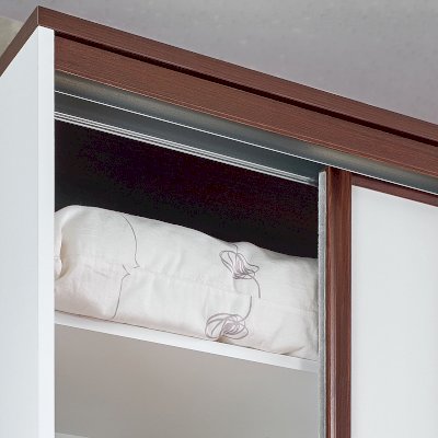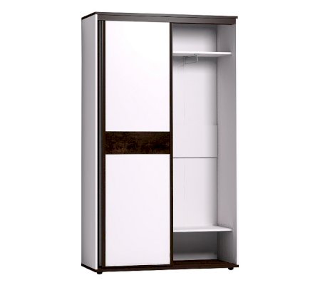 Небольшой шкаф-купе в прихожую с продуманным внутренним наполнением позволяет рационально использовать площадь небольшого коридора в квартире. В комплектацию шкафа входят: выдвижная штанга и регулируемые по высоте полки для одежды. Два фасада - зеркальный и глухой - перемещаются на стальной системе Найди, которая обеспечивает легкость открывания, плавность и бесшумность хода. Зеркальный фасад проклеен с обратной стороны защитной пленкой. Шкаф-купе создан на контрасте: белый корпус, белый глухой фасад и декоративная вставка и горизонтальные детали в декоре Орех Шоколадный, трек и профили цвета венге. Регулируемые опоры компенсируют незначительные неровности пола.