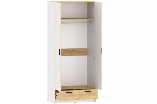 Шкаф оснащен двумя выдвижными ящиками для вещей, которые плавно и бесшумно скользят за счет шариковых направляющих, а также овальной штангой для хранения одежды на вешалках. Шкаф можно дополнить другими модульными шкафами из одноименной коллекции.