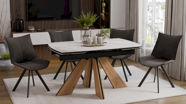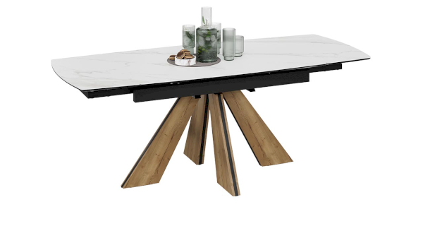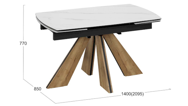 Выразительные формы столешницы и торцевых вставок, выполненных из МДФ 16 мм с керамогранитом 6 мм, смягчают скругленные углы. Керамогранит отличается высокой прочностью, долговечностью, надежностью и термостойкостью. Он не требует особого ухода и не подвержен повреждениям при регулярном использовании. Опора стола выполнена из металла с накладками ЛДСП EGGER 16 мм, в актуальном декоре «Дуб галифакс натуральный».