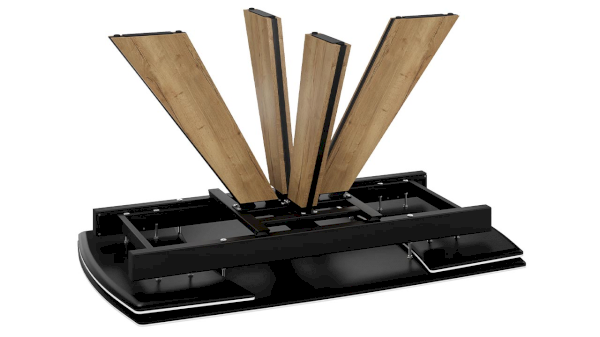 Стол имеет синхронный механизм раздвижения с торцевыми вставками по бокам. Это выручает в моменты прихода гостей, которых хочется разместить свободно и с комфортом. В основании ножек есть регулируемые подпятники для хорошей устойчивости и отсутствия скольжения. Этот функциональный элемент продлит срок службы, как самого стола, так и напольного покрытия. Процесс сборки стола минимальный, столешница поставляется уже в собранном виде, остается только прикрутить опоры.
