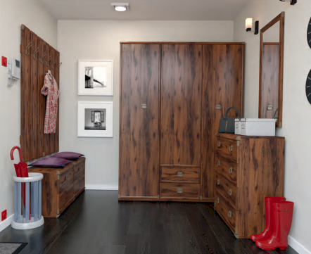 Оригинальный дизайн фасада, точно повторяющий текстуру отполированного дерева отлично впишется в современный интерьер. Дополняет общую композицию закругленные металлические края элементов мебели. В коллекцию Indiana входит большой ассортимент элементов мебели, который поможет создать интересный интерьер в комнате.
