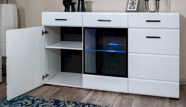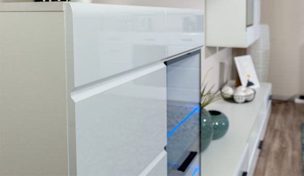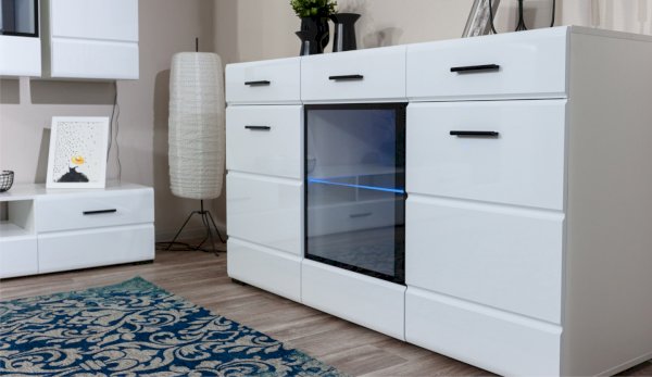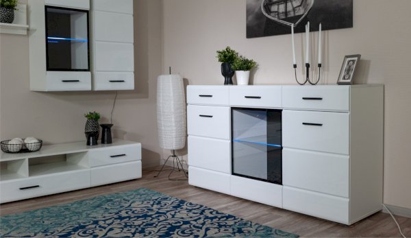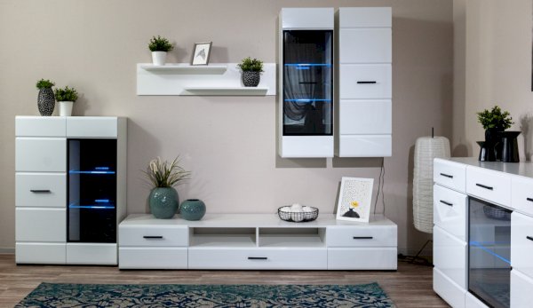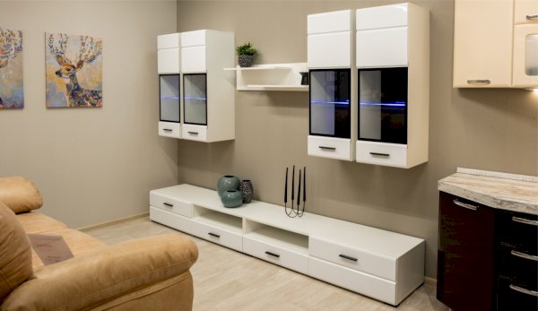 Модульная система Йорк выполнена в стиле минимализма. Строгие, лаконичные линии подчеркивают элегантность комплекта. Белый цвет мебели с деталями глубокого черного визуально сделает комнату светлее, просторнее и позволит составить безупречный по стилю комплект мебели. Сочетание глянцевой и стеклянной поверхностей, открытых полок создадут уютную обстановку и позволят украсить убранство комнаты приятными мелочами и разместить любимые книги и фото. Светодиодная подсветка придаст индивидуальность Вашей мебели. А широкая тумба для ТВ с выдвижными ящиками на телескопических направляющих позволит удобно разместить телевизор любой диагонали и другие медиаустройства Модульная система позволит подобрать по размеру вариант именно для Вашей комнаты, не оглядываясь на фиксированный размер, как в других стенках. Мебель выполнена из экологически безопасных материалов.