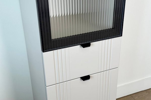 Шкаф оснащён надёжной металлической ручкой и имеет удобное внутреннее наполнение: надёжные полки за стеклянной и глухой дверцами, а также выкатной ящик. Это позволяет рационально использовать пространство.